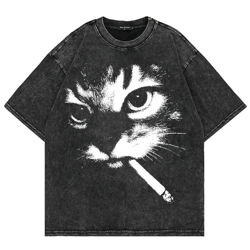100% Cotton Vintage Washed Y2k Funny Smoking Cat T Shirt Fashion Men/Women Cool Cat Joke Oversize Loose Acid Wash Tees Shirts